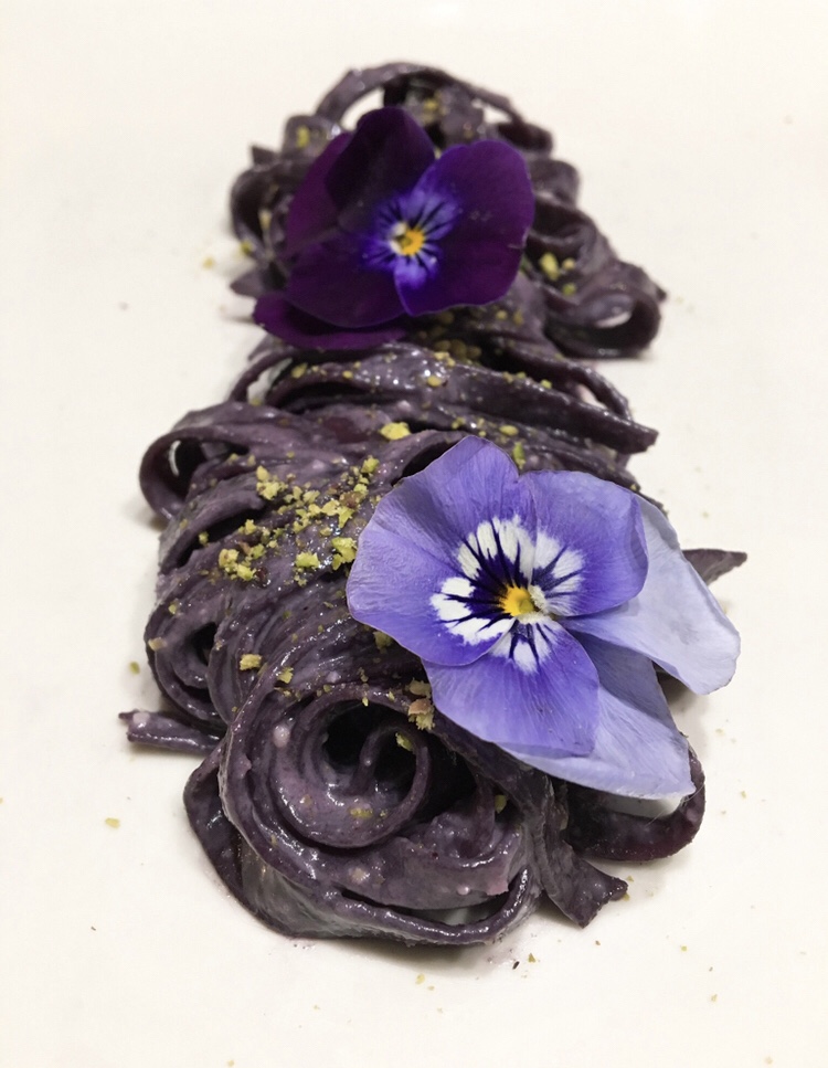 Disponiamo le fettuccine distese nel piatto con l’aiuto di una pinza e decoriamo con granella di pistacchi e un paio di viole eduli per piatto.