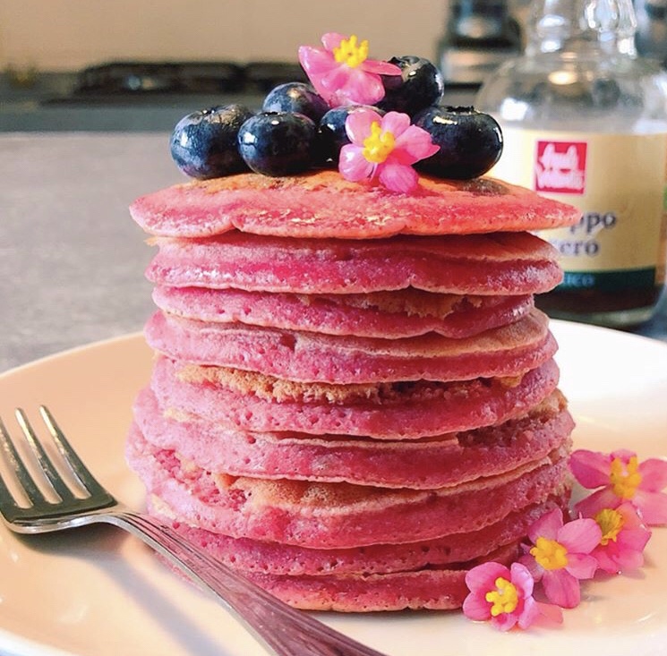 Torretta di pancakes alla barbabietola rossa, sciroppo d’acero biologico, mirtilli e fiorellini di begonia rosa.