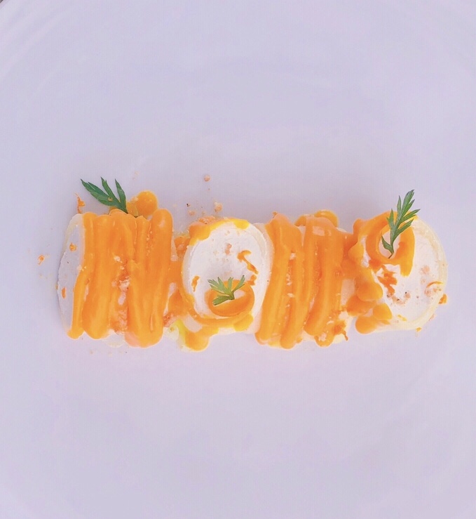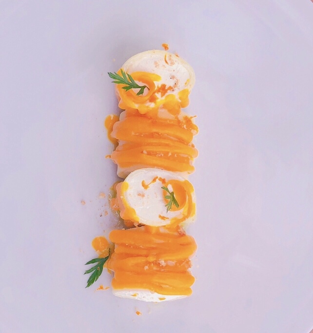Ora impiattiamo: disponiamo in modo alternato i mezzi paccheri (uno verticale e uno orizzontale e così via) ,ricopriamo con la salsa di carote e zucca (col biberon da cucina) creando delle strisce.