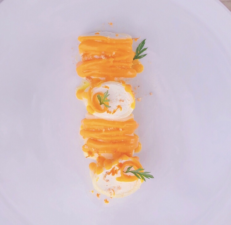 Poniamo qualche briciola di amaretto, le carote crude croccanti e le foglioline di carota.