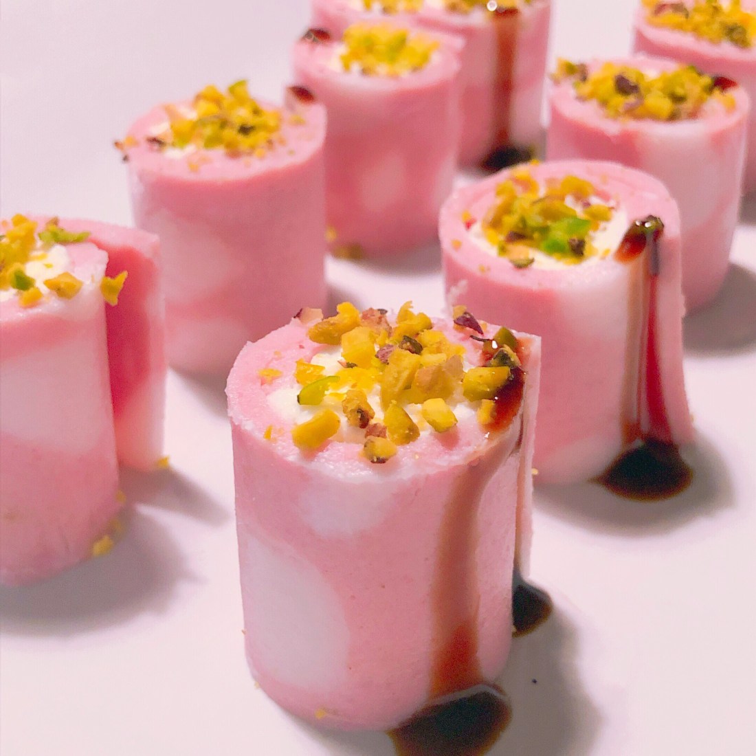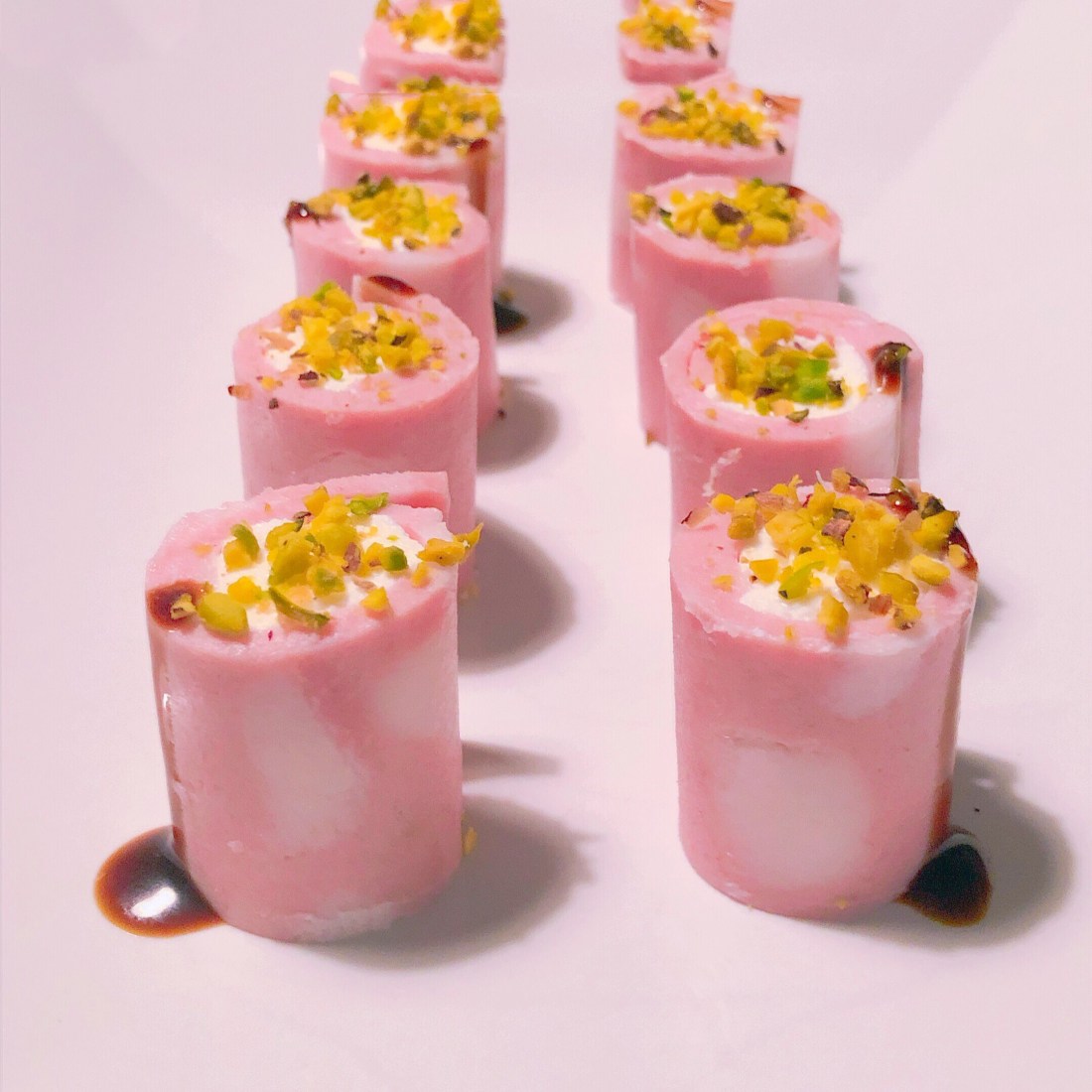Passato il tempo di riposo togliamo la pellicola e tagliamo in parti ugali (circa 2,5/3cm), disponiamo in verticale e mettiamo sulla superficie di ciascun rotolino i pistacchi.