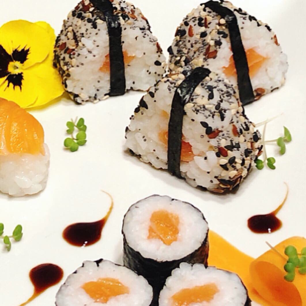 - Formiamo delle palline di riso, posizioniamo al centro il salmone (o il tonno) e con l’aiuto delle mani creiamo una forma triangolare.