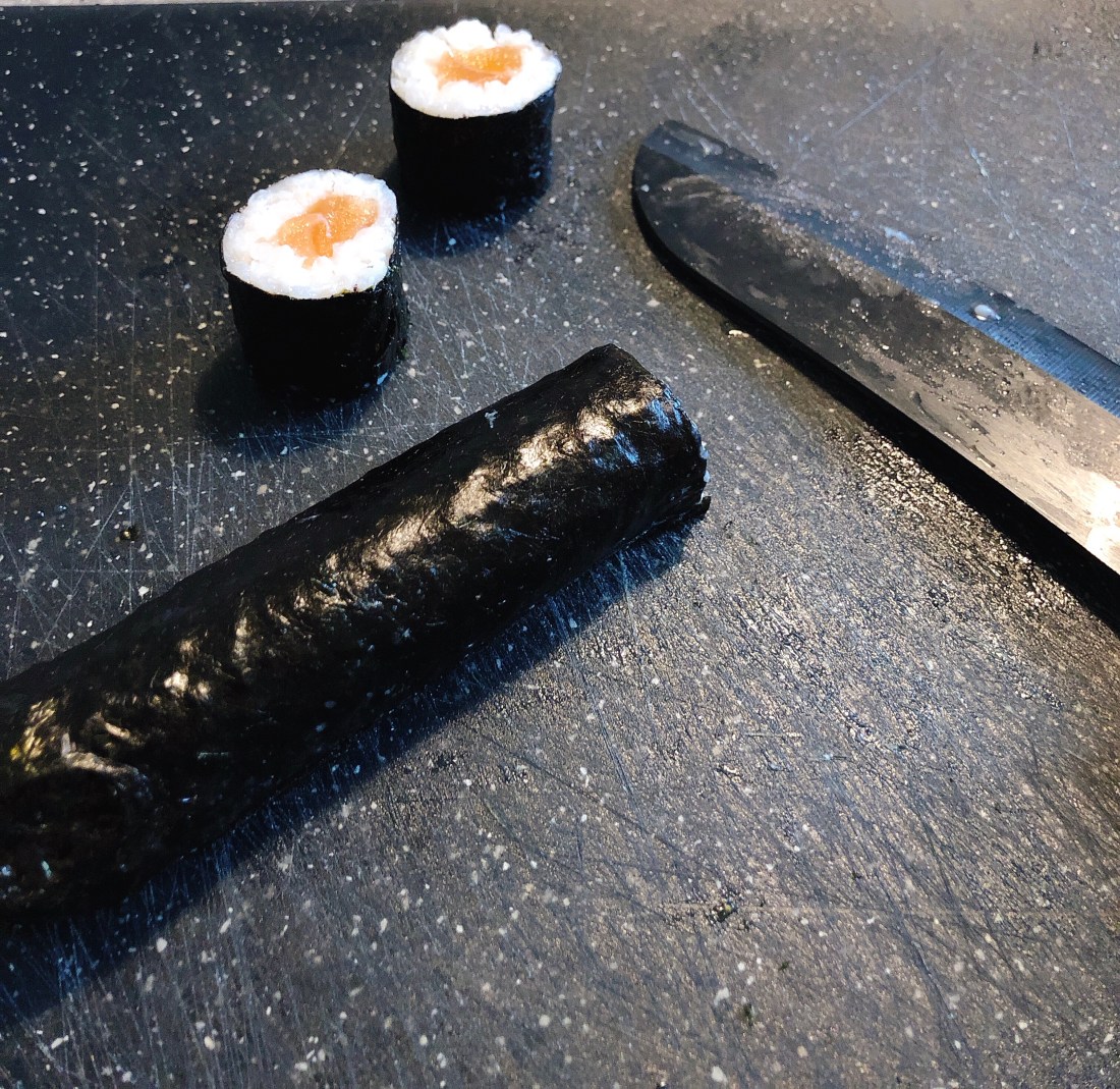 - Ora con un coltello ben affilato,tagliamo il sushi , bagnando ogni volta la lama sotto acqua fredda affinchè l’alga non si attacchi.