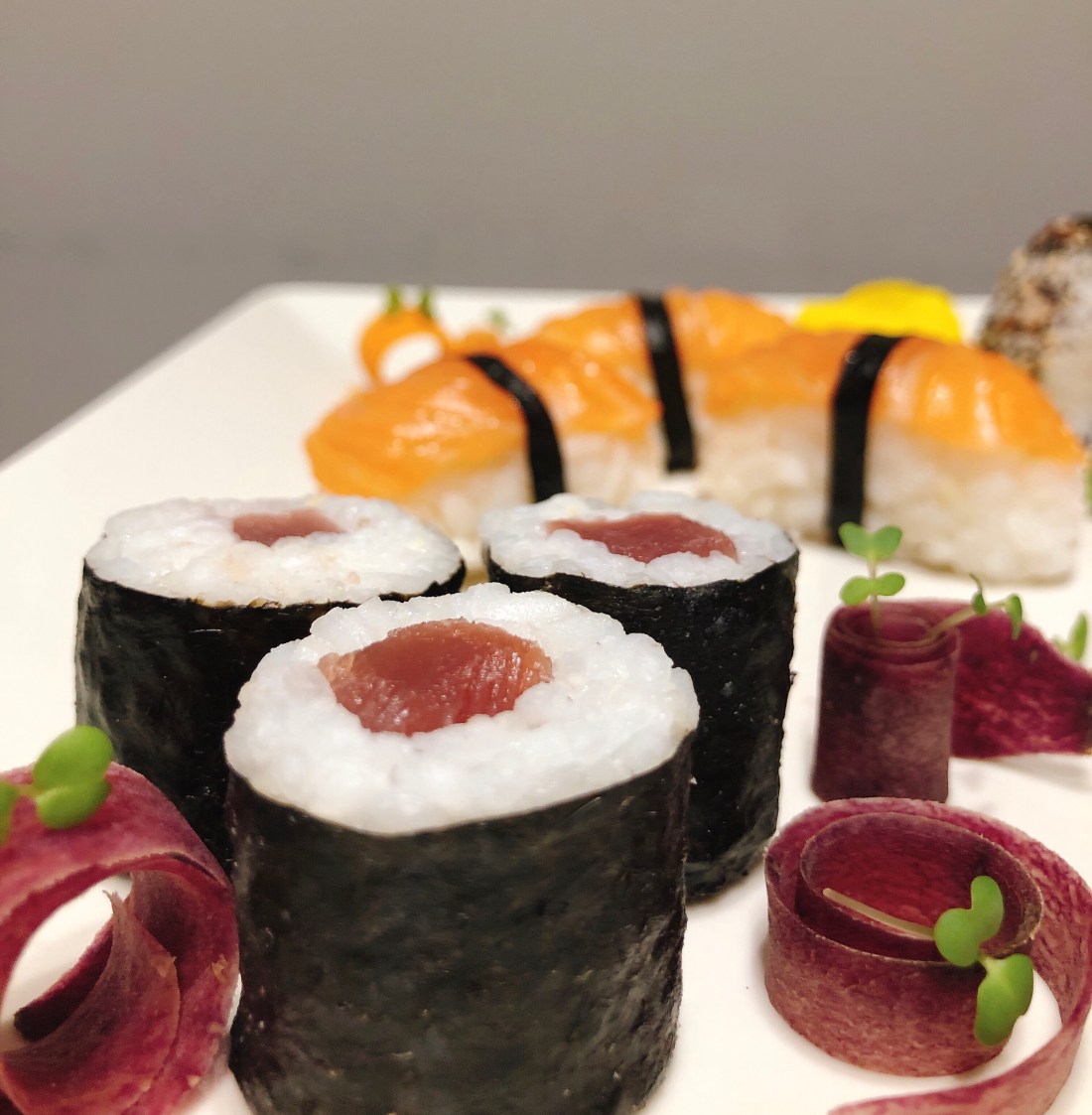 - Tagliamo con un pelapatate le carote a striscioline sottili , arrotoliamole su se stesse e disponiamole col sushi in ciascun piatto.